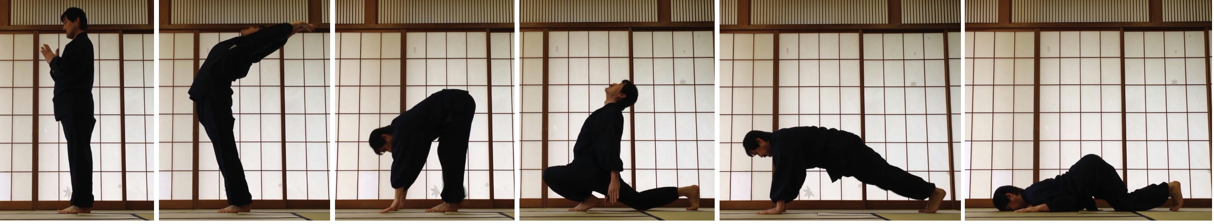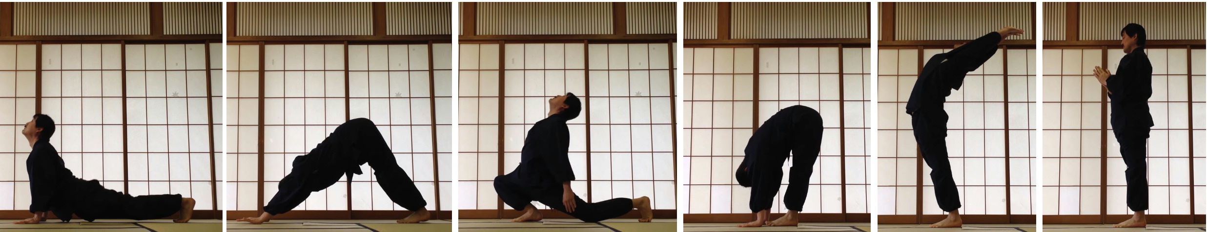 12の体位が流れるように連続し、各体位を統合的に行うものですが、動作と呼吸がぴったりと一致するように実践することで楽に実践できると共に、呼吸の安定から瞑想的に実践することができるようになります。
